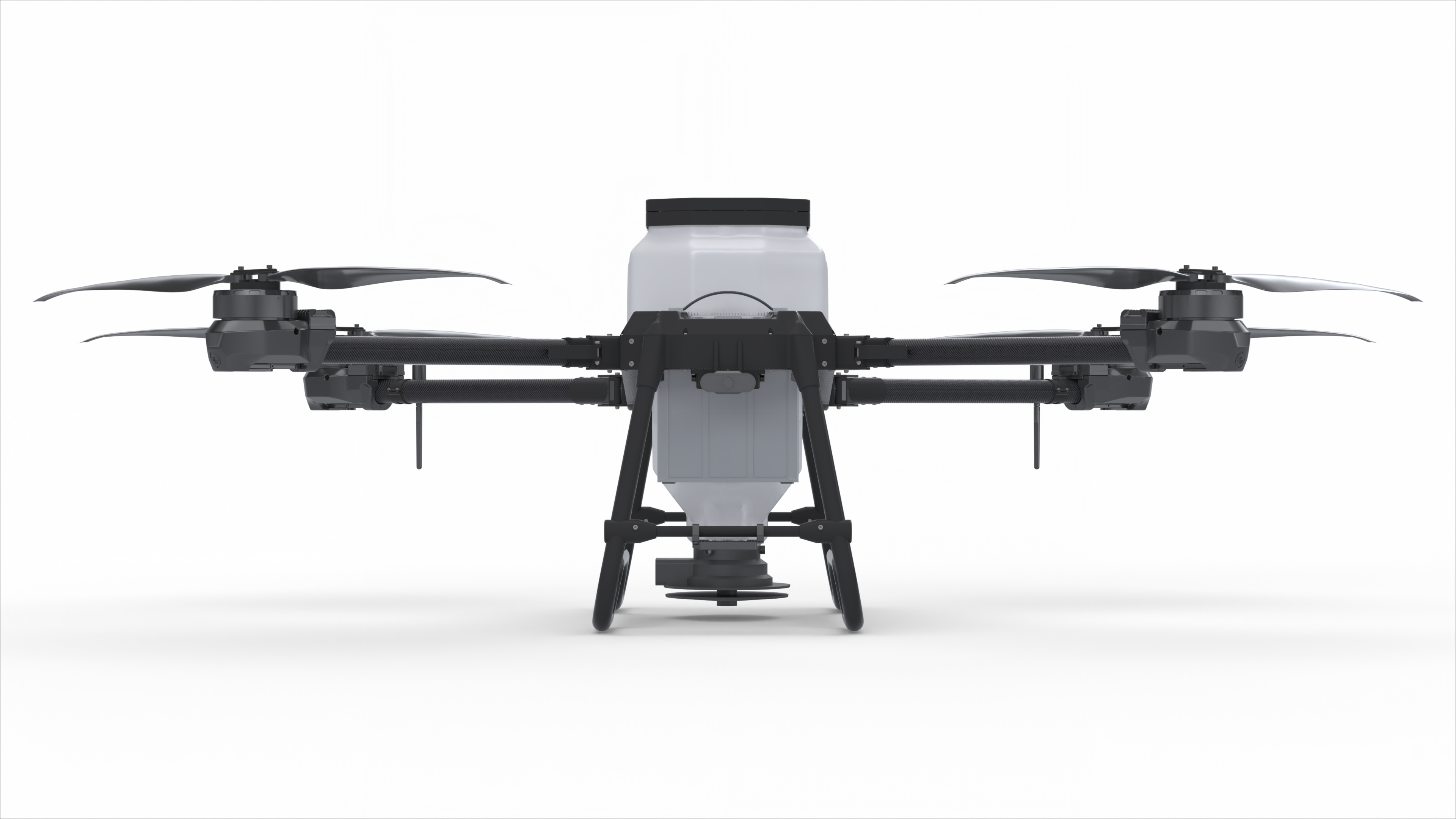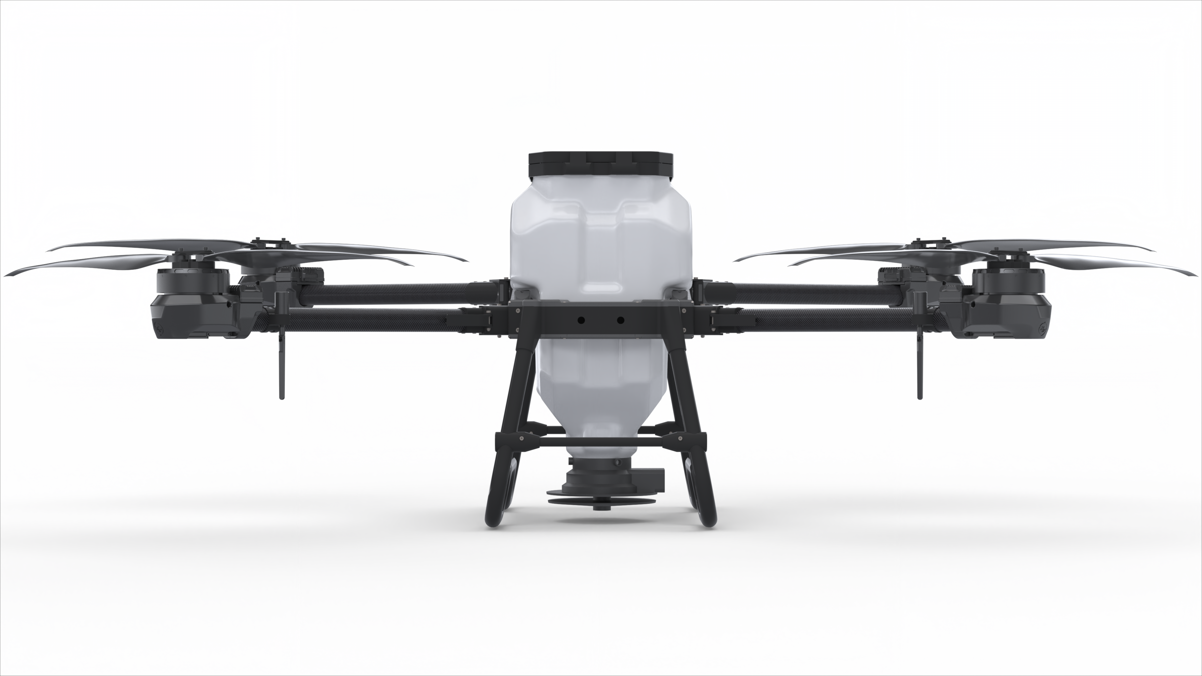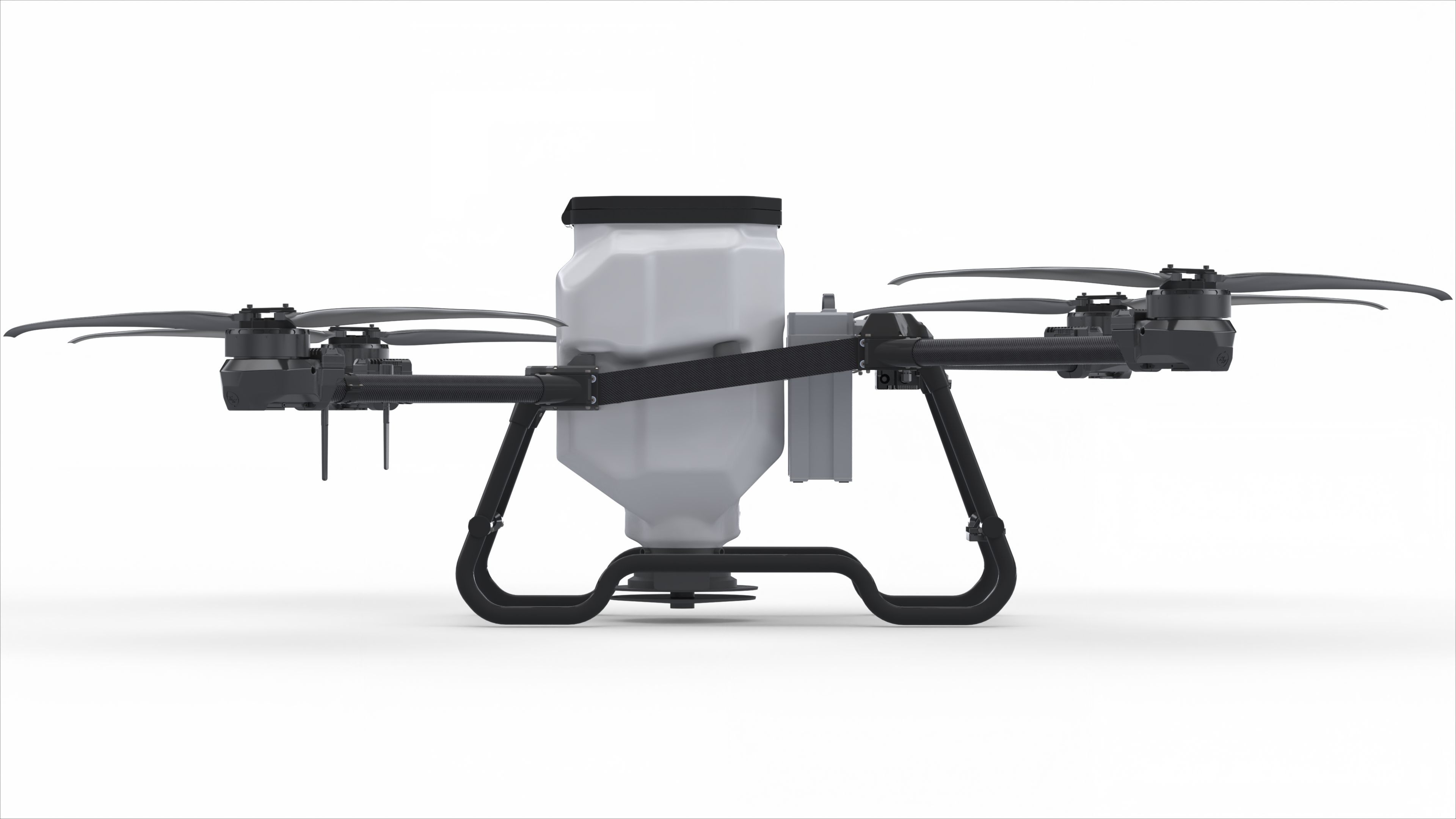 Агродрон оснащён высокопроизводительной системой разбрасывания, размещённой под ёмкостью вместимостью до 50 кг, с поддержкой сухих частиц диаметром от 0,5 до 6 мм. Ширина разбрасывания регулируется в диапазоне 4–12 м, что позволяет адаптировать работу под различные культуры и агротехнические требования. Максимальная производительность разбрасывателя достигает 1100 об/мин, обеспечивая стабильную норму внесения.